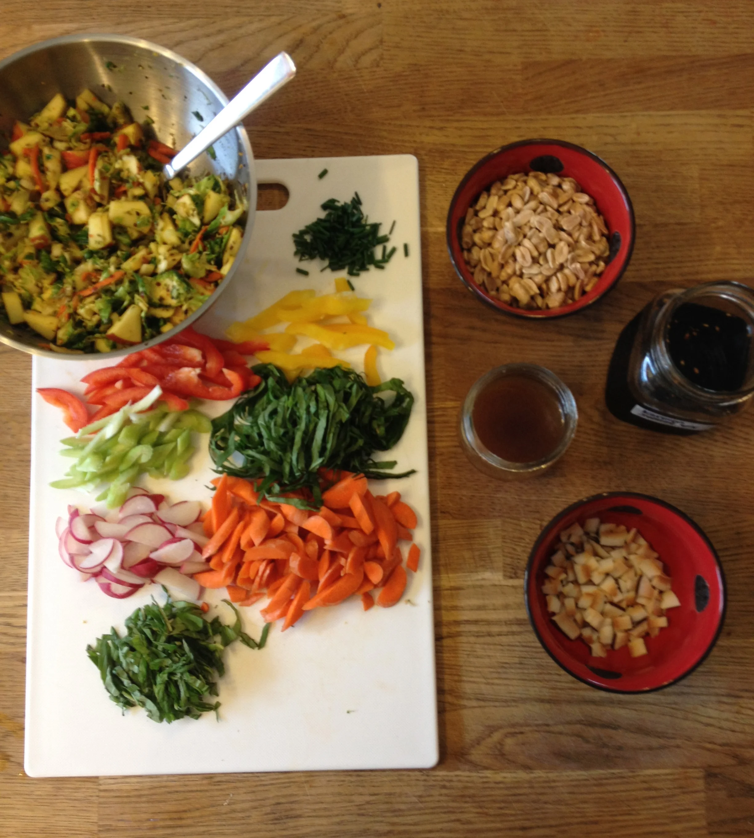 Toss it all together a few hours before you plan to eat it, in order to have the flavours meld. Eat up! Lovely on a noodle bowl, or in a wrap, or on rice, or wherever you need good food.
