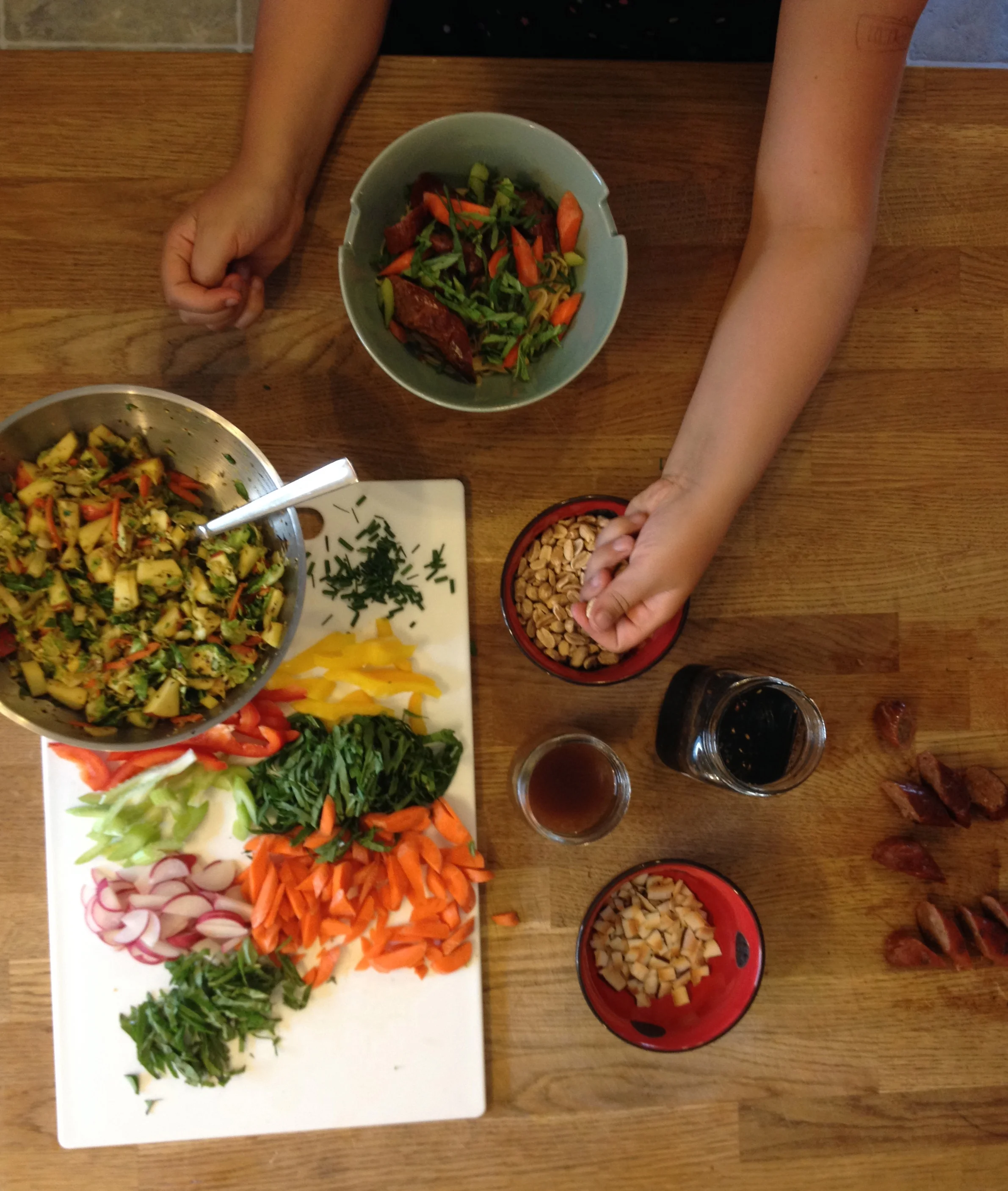 This is the kind of salad that is a good fit for bigger groups, especially families. At our house, we have one eater who is more particular about the flavours and textures than the other two, and so this is a way to encourage her to eat more vegetables. I chop all the fresh veg I have in the house that will work, put them in little piles on the table, and she gets to pick at least 3 from the bunch, 3 different colours. That's the deal. And she gladly obliges!