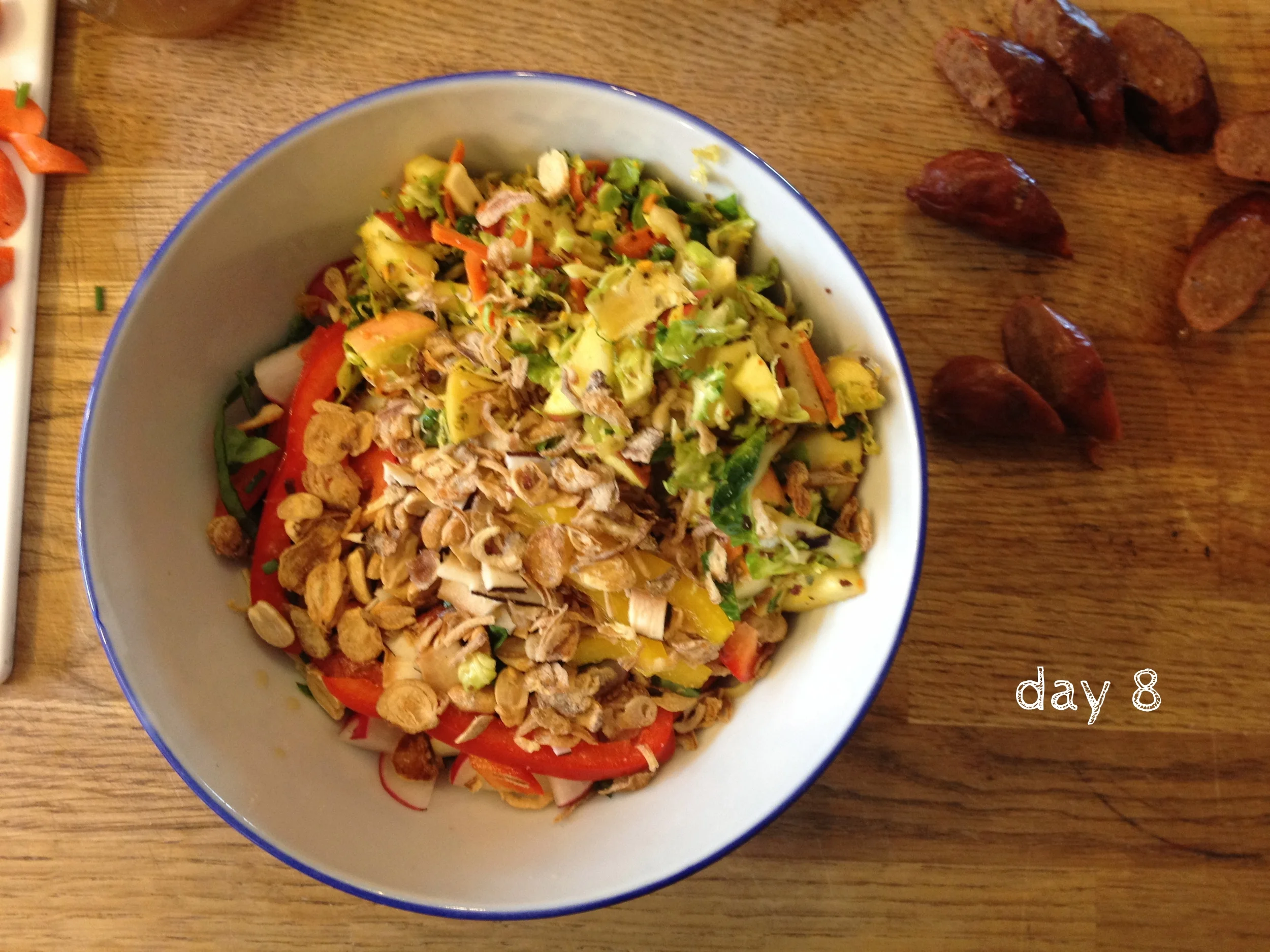 I tend to go toppings-crazy. Brussels Sprouts Kimchi Styles Salad.