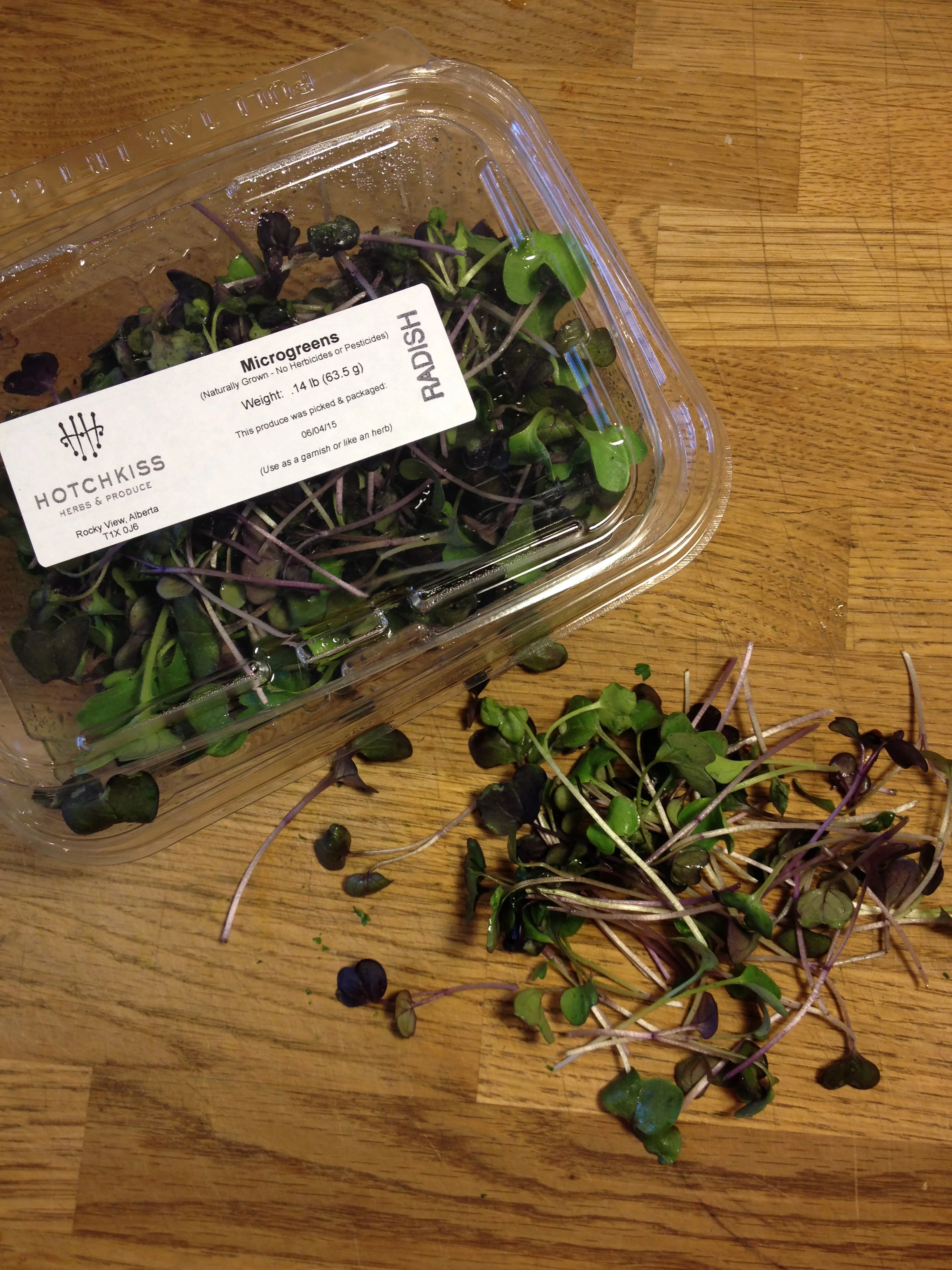 Whisked the dressing together first, to make sure it was tasty enough: about 1/4 cup good quality olive oil, added about 2 tbsp pomegranate molasses (you can find this at any Middle Eastern shop, my favourite being Shaganappi Grocer on 17th Ave SW, just west of 36th Street on the south side), about 2 tbsp red wine vinegar to up the sharpness, juice of one lemon, pinch of sea salt and grind o pepper, and adjusted til it tasted right. Chopped in this mess some fresh mint from the garden, parsley too, added these here local delicious radish sprouts courtesy of Hotchkiss Produce, some of their pea sprouts too, and chopped up some watermelon, I would say maybe 2 cups. I forgot to mention, while I was putting this whole thing together, I put up 1 cup water with 1 cup bone broth on to boil, and threw in a cup of sprouted quinoa in there to cook for 15 minutes. Cooled it. Then added that to the salad mess. This was the result.