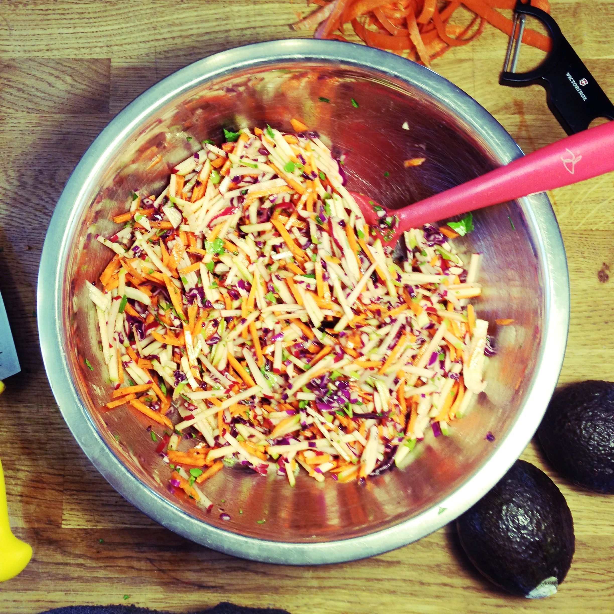 With my mandoline slicer, it took all of 10 minutes to assemble this salad. I let it marinate while I prepped the meat and heated up some organic corn tortillas in the oven, courtesy of local lovelies Tres Marias, and washed lettuce leaves for me as I am low-grains these days. I made a quick guacamole (an avocado, a garlic clove, some salt, dash of lime juice, hit of cumin and coriander seed, some fresh coriander, whizzed in processor) and put that out, along with some creme fraiche and shredded cheese. Oh yes, and my fermented hot sauce. And of course, some Brussels Sprout Kimchi. I'm not trying to show off; I'm just trying to alleviate the pressure on the top shelf of my fridge.