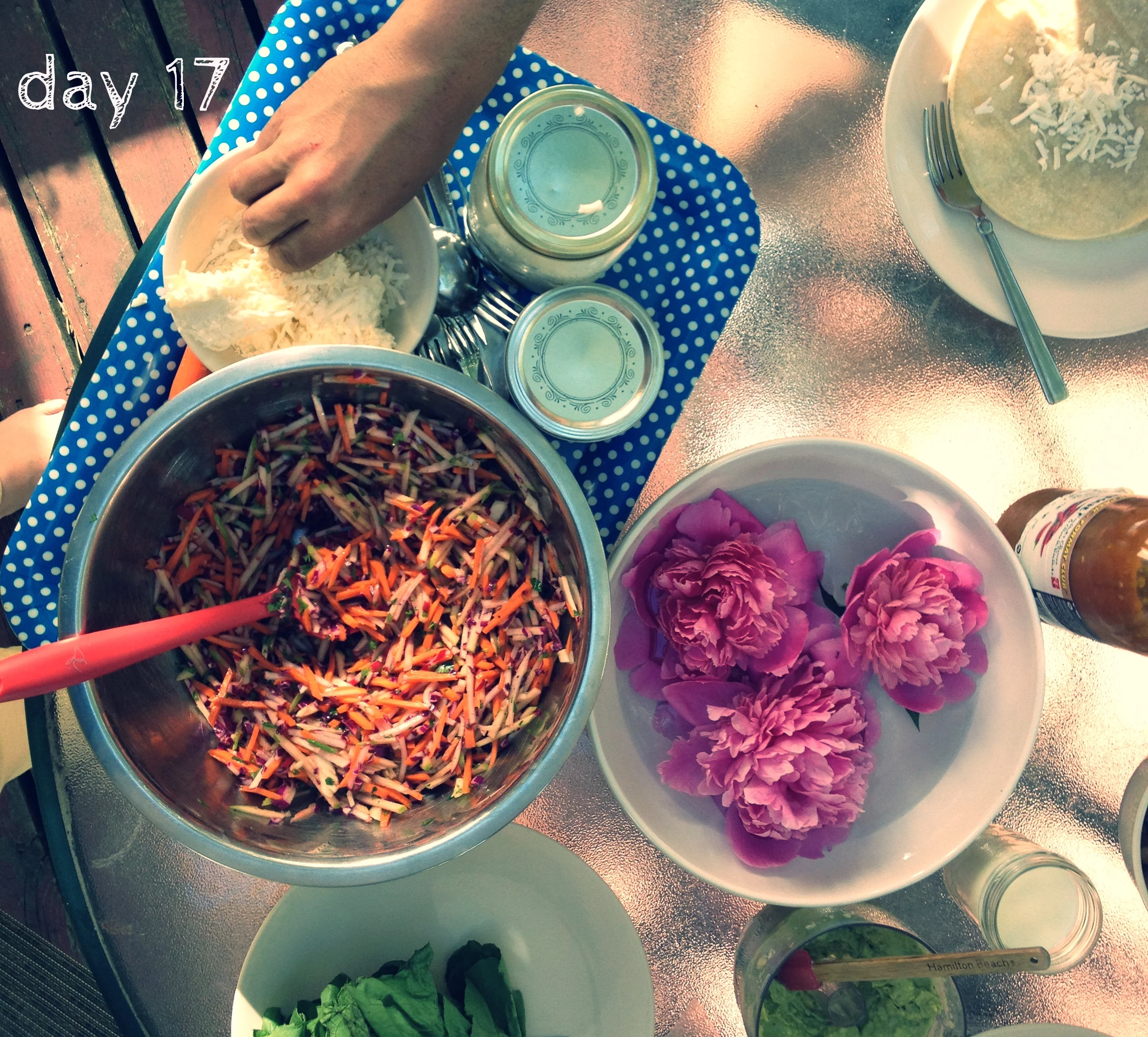 Day 17 - a whirlwind of a day. Last full day of school. Last morning fermenting class. (Thanks ladies who made me laugh this morning! Such a hoot.) Also, a presentation on the benefits of fermented foods tonight (thanks to those who attended!). This was a day I needed something quick and easy. And this salad is just that, with the added bonus of being zingy and crunchy!