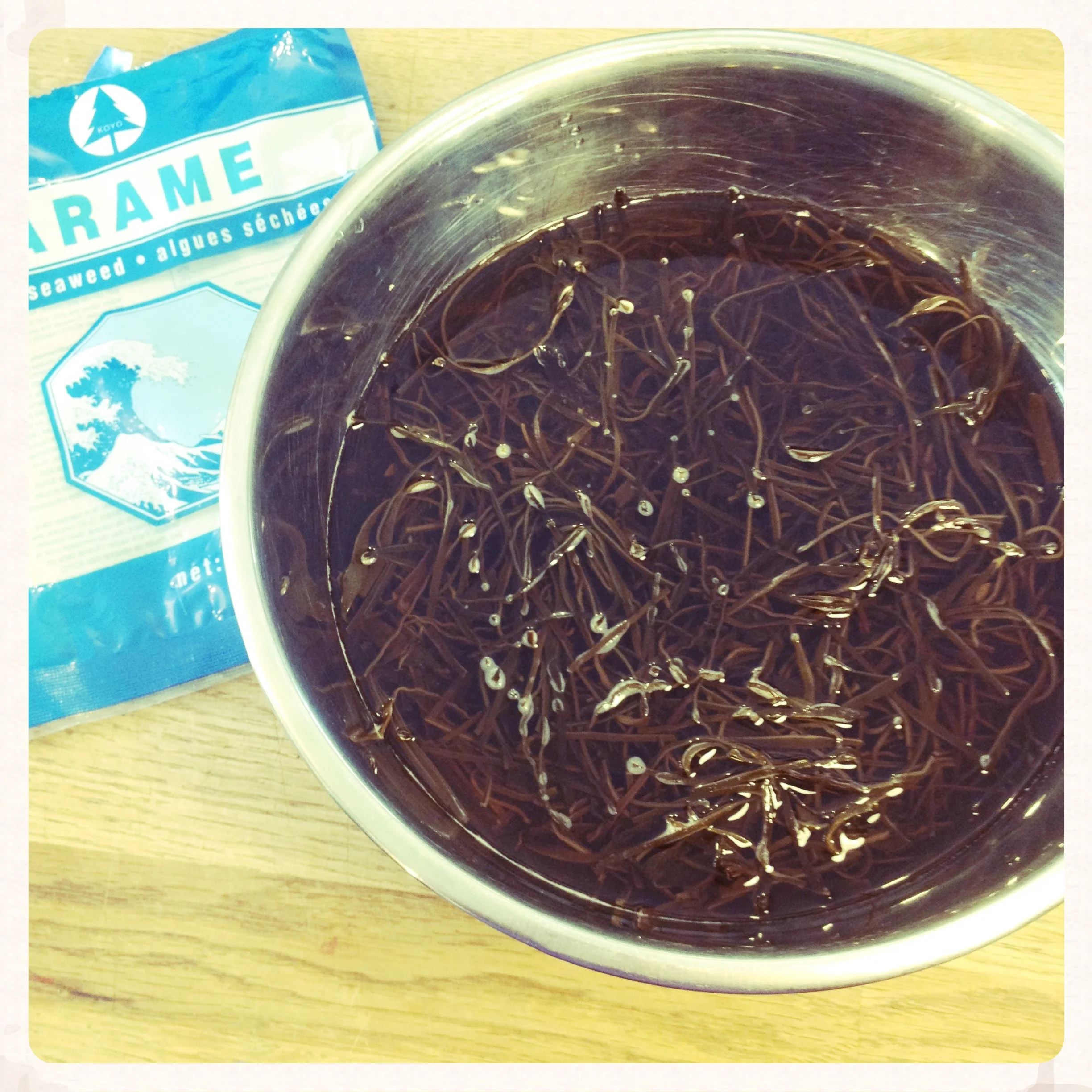 The how-to: drop a whole 50g package of seaweed of your choice in a big enough bowl, knowing that the seaweed will at least double in size. I chose to soak a package of Arame seaweed, as it's already shredded in tiny strands. (I'm a bit lazy, see?) Cover the seaweed with enough filtered water, adding more as it swells in size if need be. Let it soak for minimum 30 minutes; drain the seaweed. You could reserve the water to use as a mineral-rich addition to your plant water or your garden or compost pile. Waste not, want not.