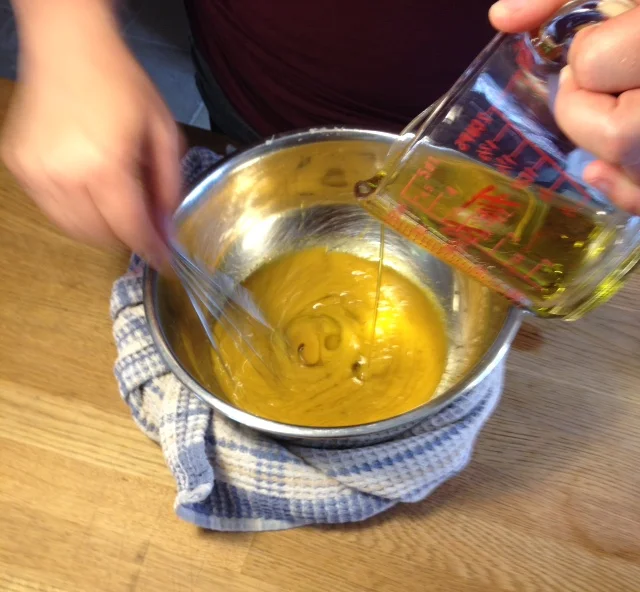 Add all of your ingredients in a big enough bowl. In a separate measuring cup, measure out 1 cup of a good quality olive oil. Roll up a tea towel and nestle the mixing bowl on this towel roll. With a steady hand, and a clear mind (I'm being serious), use your wire whisk to slowly start incorporating the ingredients together. Think of it as if you are introducing the ingredients to one another. Once you feel like the groove is set, and you're ready to bring it to the next level, start with a very slow drizzle of olive oil, all while still continuing to gently whisk. This is not something you want to rush; trust that it will work. Drizzle that olive oil very slowly for about 10 seconds, and then stop the drizzle but continue to whisk. Once the oil has emulsified (that sheen off the top now becomes a dull colour), start the olive oil drizzle again, continuing on with the whisking. When you are about halfway through the olive oil drizzle, take a bit of time to make sure it is emulsifying properly, meaning there will not be an oil slick on top. The dressing will start pulling at the sides in the bowl. It's really quite a beautiful alchemy kind of thing happening. If the oil appears to be separating and that sheen is still there on the top, this means it isn't emulsifying and you will want to start over with a new yolk in a new bowl, adding another 1/2 tsp of mustard. The stuff you just whisked together (unsuccessfully) can now be introduced EVEN SLOWER this time into the new yolk/mustard mix.