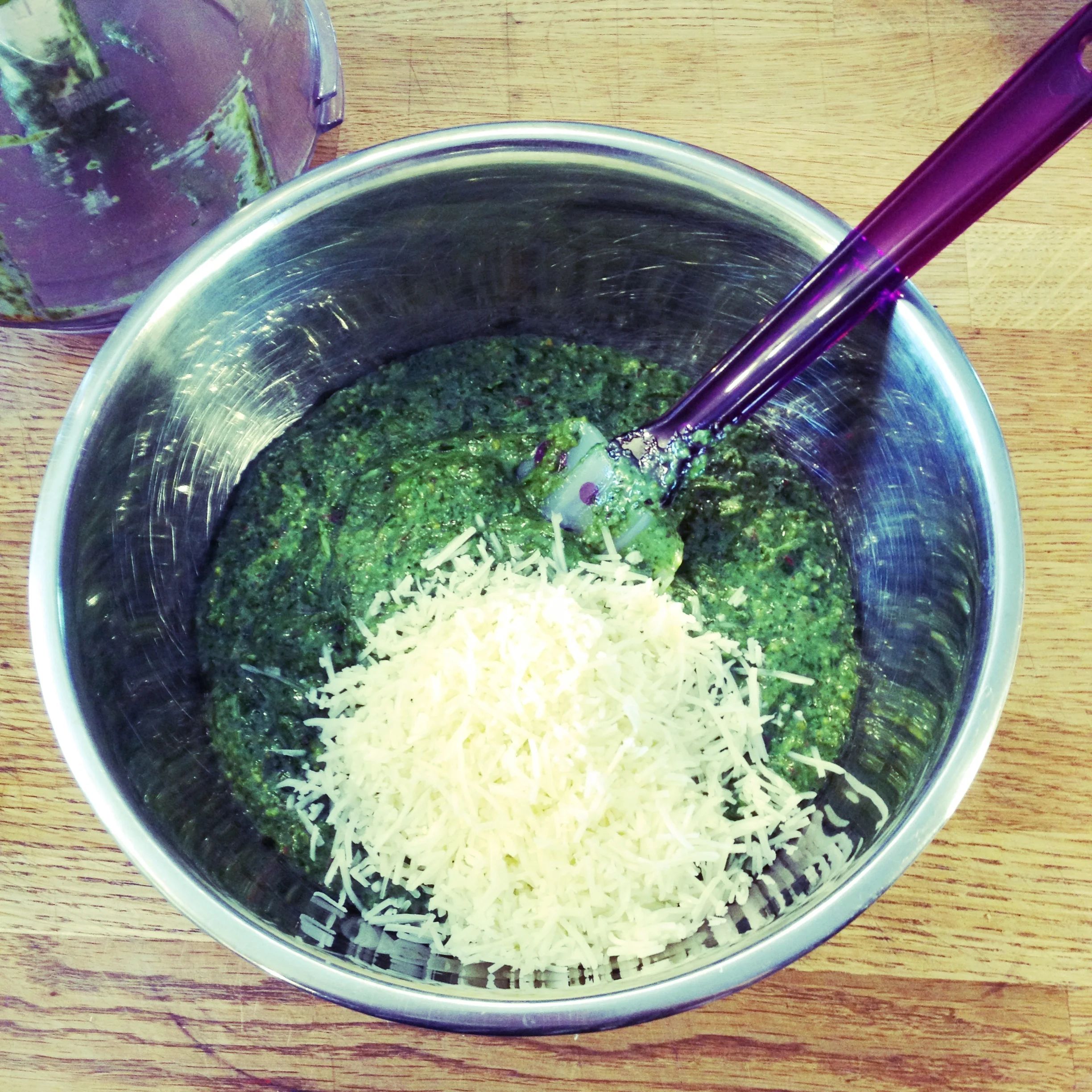 I took out my food processor and blitzed 1/2 cup of pistachios with 2 cloves of that fresh garlic. When it was crumbly, I added in 2 cups of arugula and 2 cups of basil leaves picked off the stems. I also threw in 1/2 tsp of sea salt, the juice of 1/2 lemon, 1/2 tbsp of honey and whizzed that whole thing in to a paste. When it was all combined and crumbly even more, I kept the motor running whilst adding a whole 3/4 cups of good quality olive oil. If you're feeling adventurous, you could up the nutritional ante and superfood-it-up: I added 1/2 tsp of spirulina (super immune supportive, and liver loving, you can find this at your favourite local health food store), 1/2 to 3/4 tsp of seaweed flakes (rich in minerals, and iodine which will give your thyroid a wee high five), I also added 1 tsp of chipotle in adobo sauce because that hint of kick and smokiness just rounds out the sweetness from the honey and elevates this pesto to give that taste of je ne sais quoi. Blitz the whole thing together again, until it looks like a pesto. Scoop it out into a bowl, and mix in by hand 1/2 cup of your cheese of choice, be it parmesan or asiago or whatever you have on hand. I did asiago.