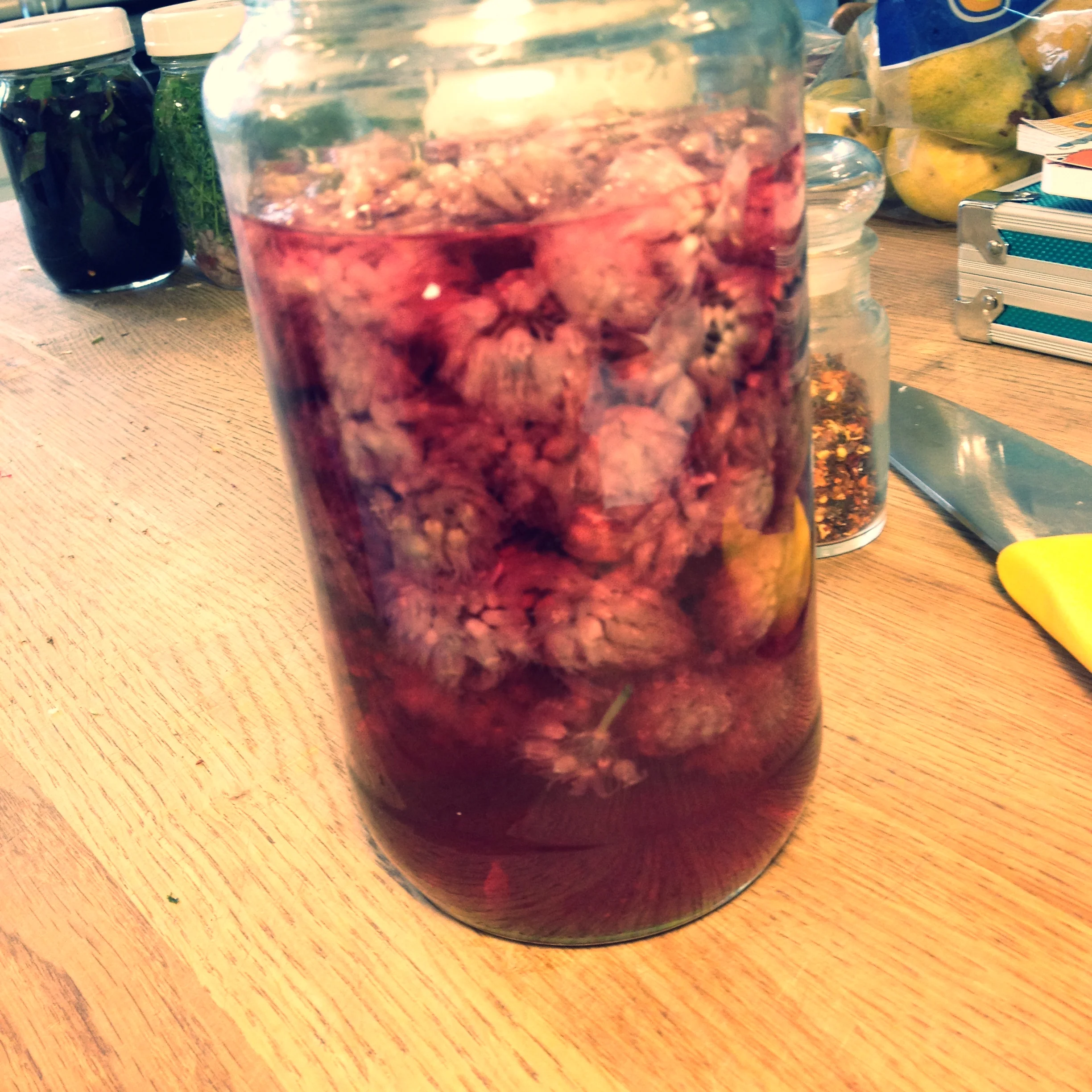 Lemon thyme & shallot white wine vinegar, Sage & peppercorn & chili red wine vinegar, chive blossom vinegar. Herb-infused vinegars, #harvest2015.