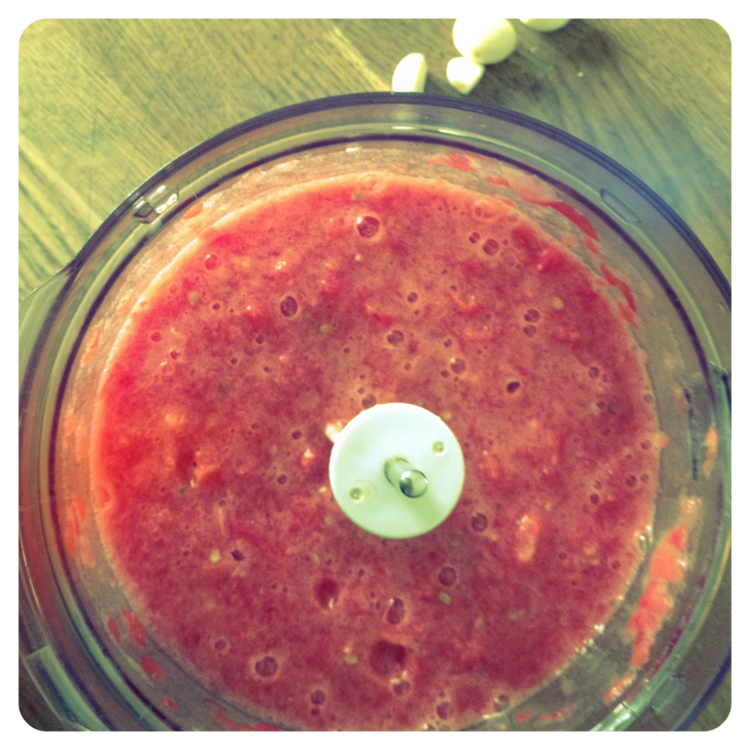 Amongst other things this week, I am putting up an octupled version (yeah I did) of the quick and easy pizza sauce, which I broke out into two big batches. For each batch, I washed about 28-30 roma tomatoes, and threw them in my mixer along with about 9-10 garlic cloves, and blitzed them to high heavens. I did not take off any stems nor did I peel the skins, because have we not figured this out yet? I'm as lazy as they come. To this mash, I added four teaspoons of dried oregano and some dried chili peppers, along with some sea salt and cracked pepper.