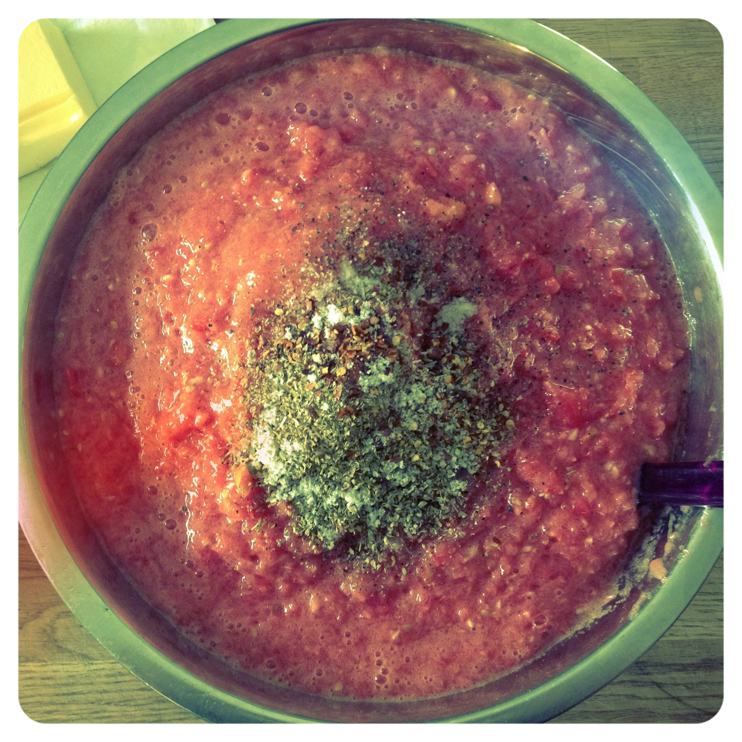 Chopped tomatoes, garlic, oregano, hot peppers, S+P. Coming to a pizza near you. #harvest2015