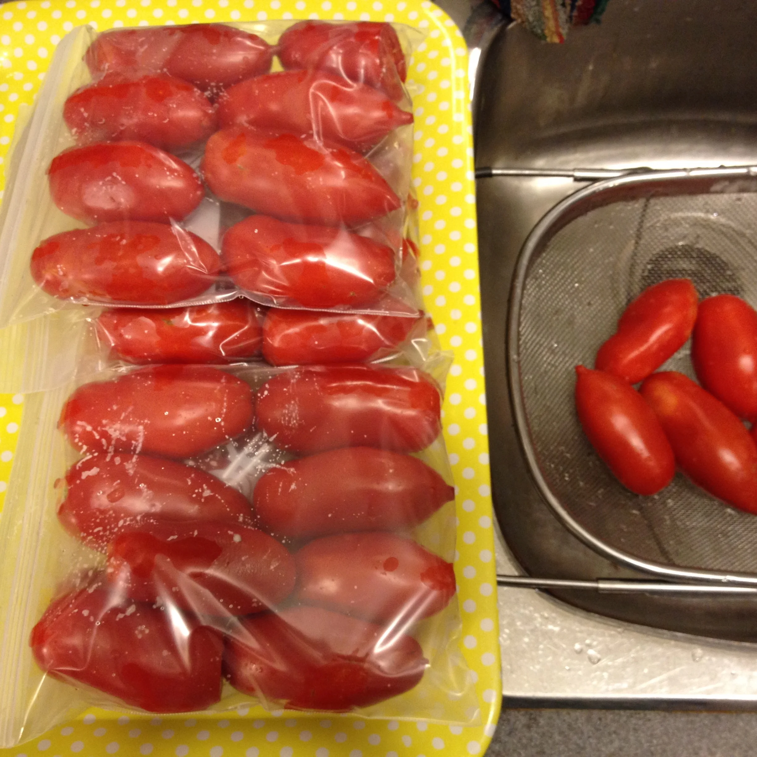 THE HOW-TO: Make sure to wash your hands first. Always a good idea when you are preserving something, or working around food for that matter. Next, wash your tomatoes in small batches, making sure they can drain off excess water. I buy new freezer plastic bags to do this every year, and I find I can stash about 6-8 little romas in one medium sized bag, and this will give me the same amount of tomatoes when my recipe calls for a can of tomatoes. I make sure they're flat in the bag, and put them on a tray or cookie sheet, and stash them as-is in the freezer so that once frozen, they'll be easy to stack one on top of the other. So stinkin easy I can't even tell you. And so much less expensive than buying cans during the winter months.