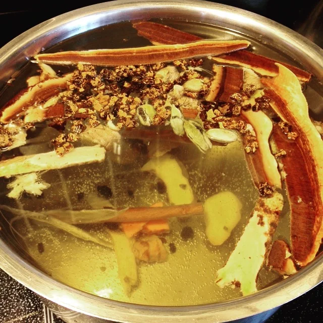 My medicinal mushroom tea with reishi, chaga, astragalus, ginger, cardamom, turmeric, pepper