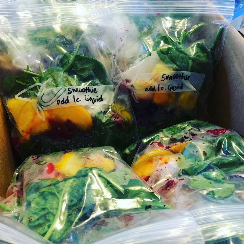 We set medium-sized freezer bags propped open in a box, and dumped a handful of spinach in each bag, a handful of slivered chard (without the stems), a cup of berries, a few slices of peaches, a tablespoon of coconut oil, a tablespoon of chia seeds, a teaspoon of matcha green tea powder. We wrote on the bag to include some creme fraiche and a cup of kombucha for the day she will be using the baggies. Easy peasy.