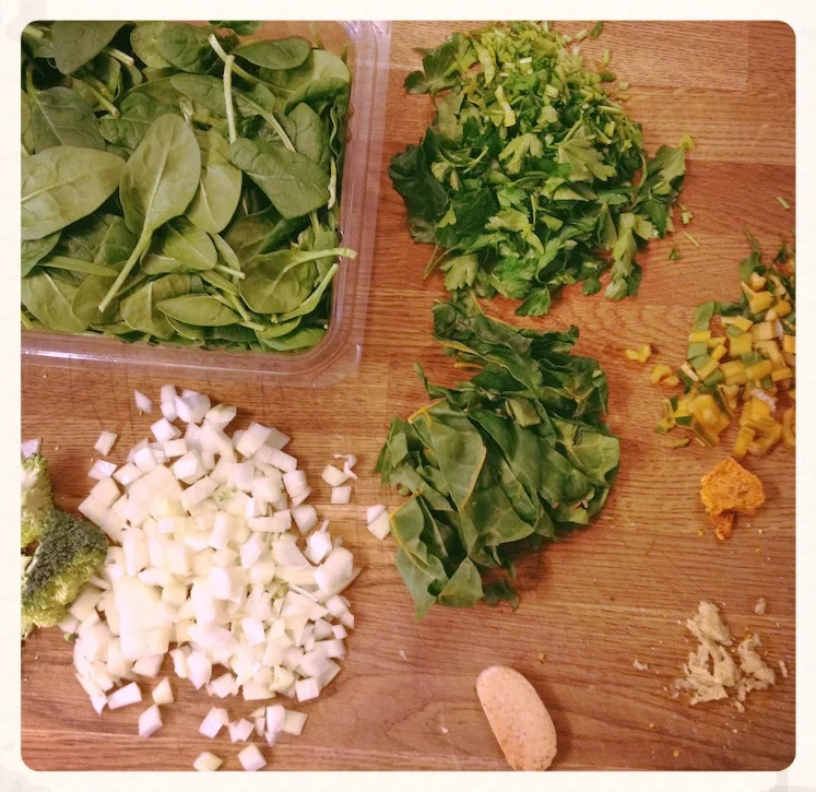 This is a great way to get those greens in. It's also one to tuck in the 'Remember for the Summer' file, for when your garden is overrun with greens and you just don't know what to do with them. For this recipe I made last night, I used a big container of organic spinach, threw in 3 leaves of swiss chard (chopped the ribs separately and added them earlier in the cooking time along with the onions), about a handful of broccoli and half a bunch of fresh parsley, stems and all. I love adding fresh herbs to this kind of meal, as aromatic herbs tend to be higher in polyphenols and antioxidants, and where there are polyphenols, one should think 'anti-inflammatory' and 'liver love'. (Same goes for cilantro. That would be yummy in this dish!)