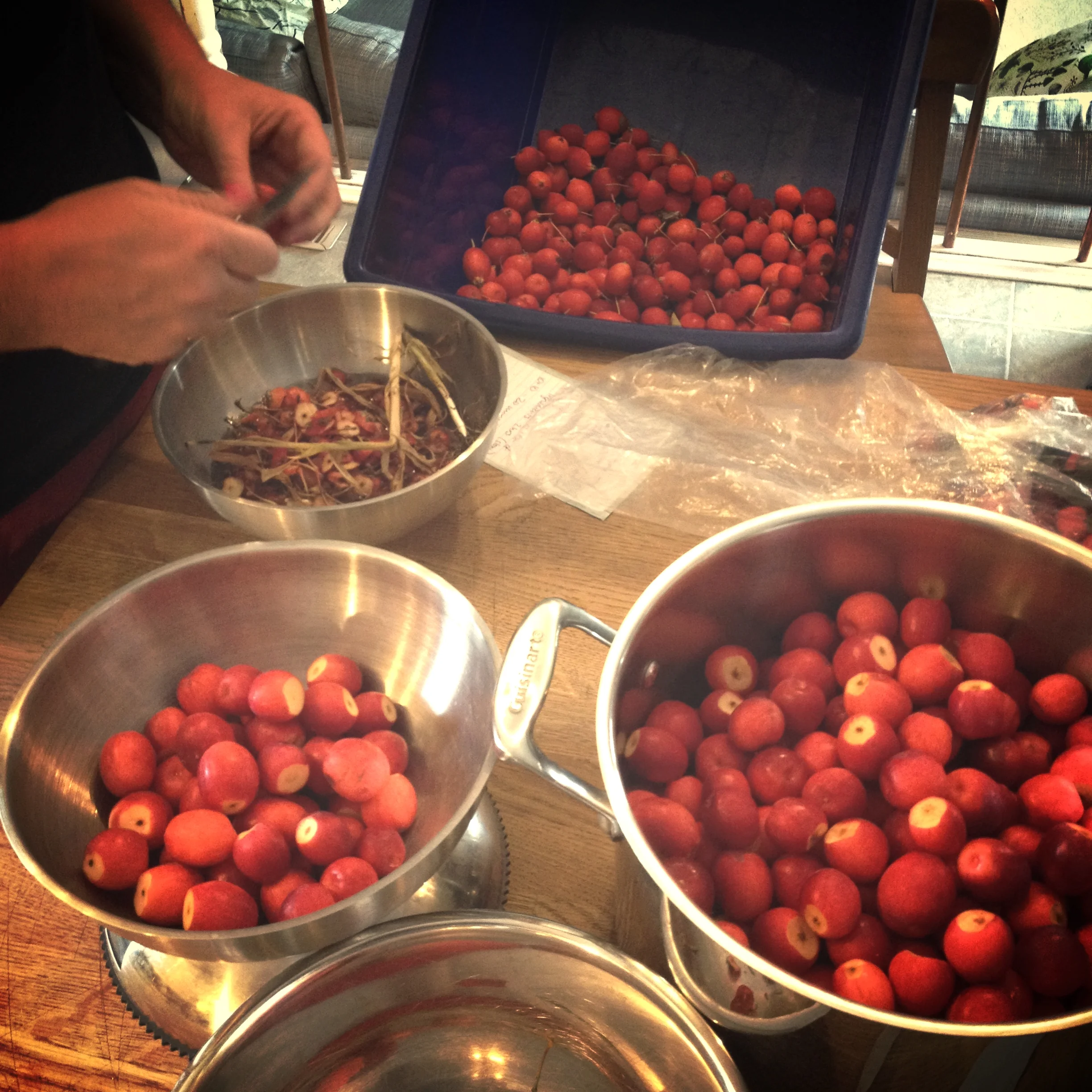 Today is the last instalment of putting up the harvest for 2015. I have enjoyed this challenge of coming up with new ways to keep the freshness going into the winter months, tried new things, revisited old favourites, and so I thought to end this stretch of food-prep that I would go back to one of the first things I ever did as a homesteader-wannabe: canning. I haven't talked about canning this month at all because truth be told, I don't do it much anymore. I find it is quite a bit of extra work, my stove top is not the best one rated for water bath canning; it isn't as forgiving an art as say, fermenting. But it is a practical way to be able to put up a big amount of one thing like zucchini into relish, or peaches into canned jewels, or tomatoes into salsa. And crab apples into crab apple butter.