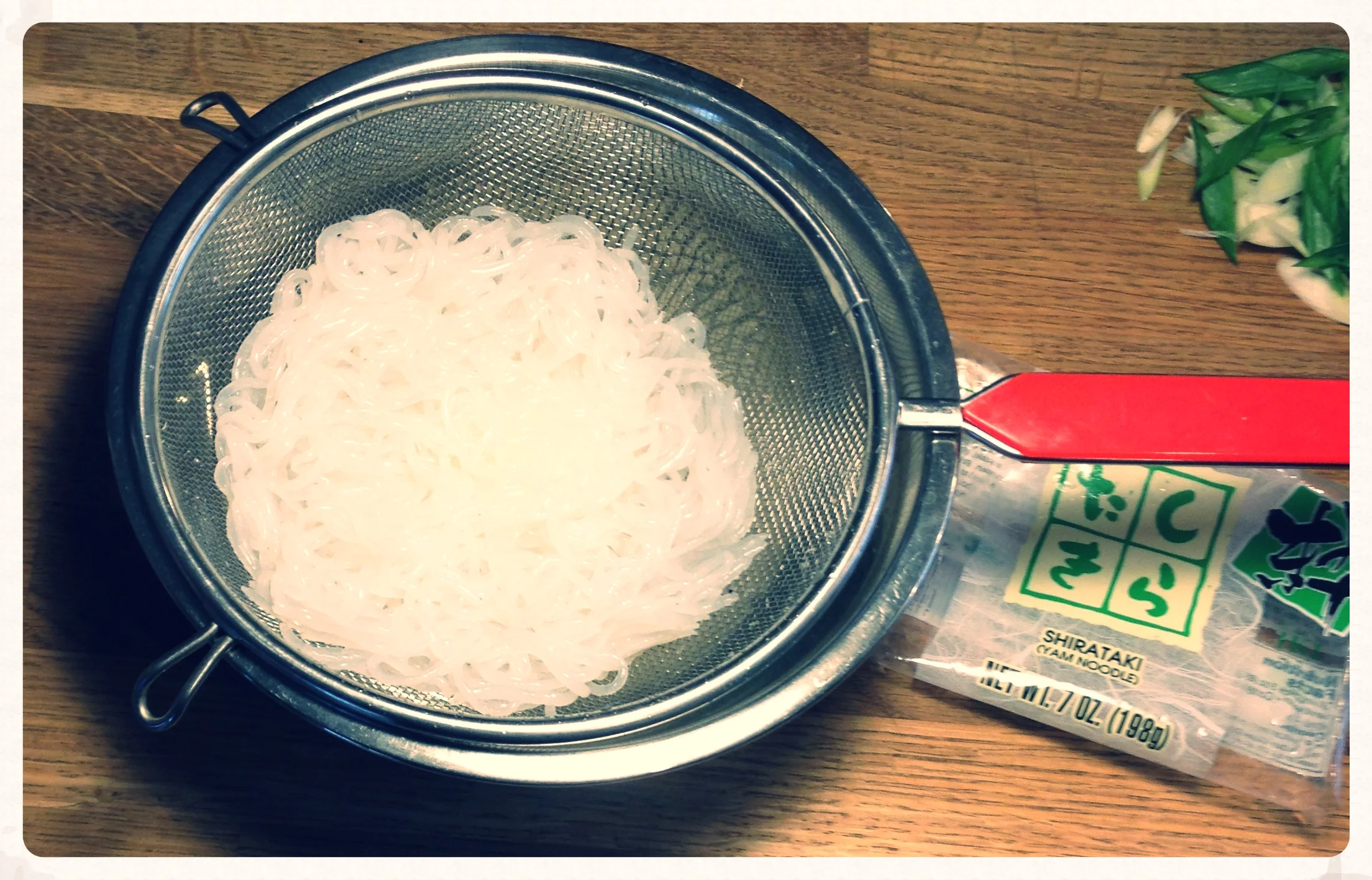 As most salad rolls come with some delicious slurpy noodles in them, I opted to pick up some Shirataki noodles while at the Korean and Japanese Grocery Store down on 10th Ave at 14th Street in the SW. These noodles are so easy to prepare: just dump in a strainer straight from the package, and rinse them out. And voila, they're ready to use up! They're a low-carb option for those who watch these kinds of things; me, I'm just looking for something quick and easy. They're made of a specific type of yam, and are quite high in fibre. They really have no taste, so lend themselves well to something like these salad rolls, especially if you have a tangy slurpy peanut mess of a sauce to bathe it all in.