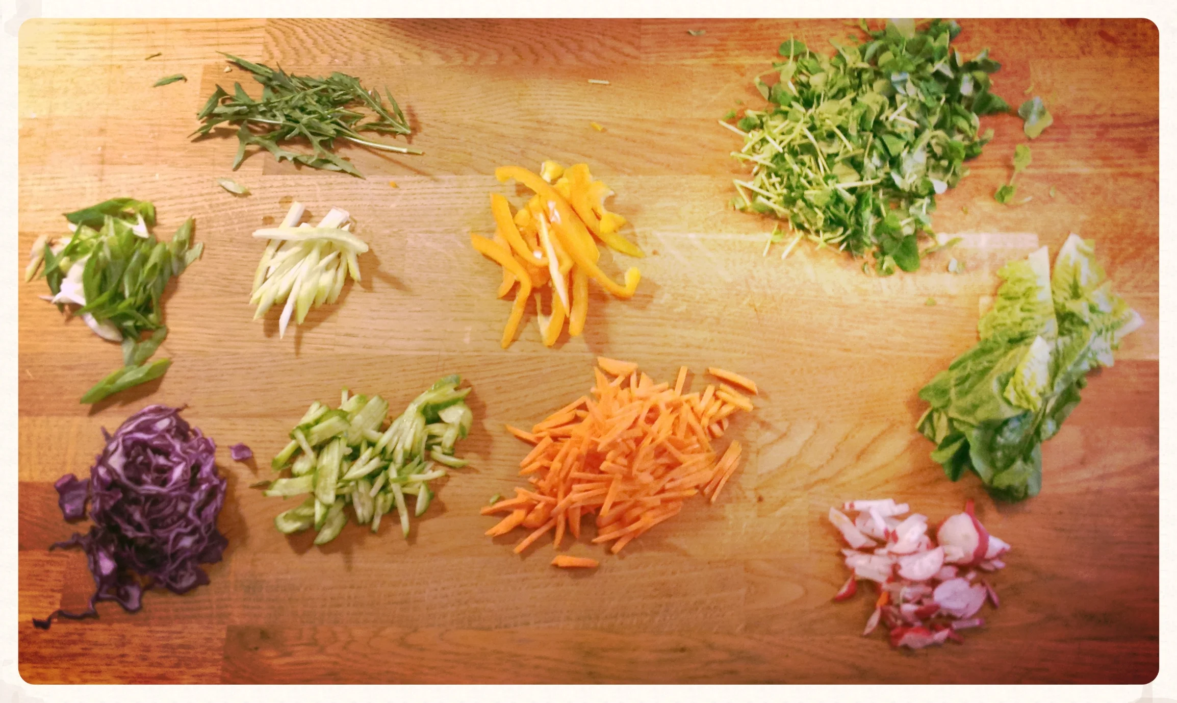 Next, I sliced and chopped a variety of veggies we had on hand. This is quite reminiscent of the piles of ingredients I had on the Vietnamese Noodle Bowl salad day; it's the same concept. Each person gets to make their own salad rolls and the rule in our house is that you have to include at least 3 different vegetables. So in our piles on the butcher block were: arugula, pea sprouts, lettuce, radishes, carrots, cucumber, red cabbage, green onion, celery and yellow peppers. Not seen: black sesame seeds. What should have been included: cooked shrimp. They're delicious in something like this, but I forgot to defrost them in time. Also delicious in this would have been some avocado. You could also add some shredded nori crackers, or a smidge of kimchi or some other ferment in the midst of the pile-o-veg. It's up to you.