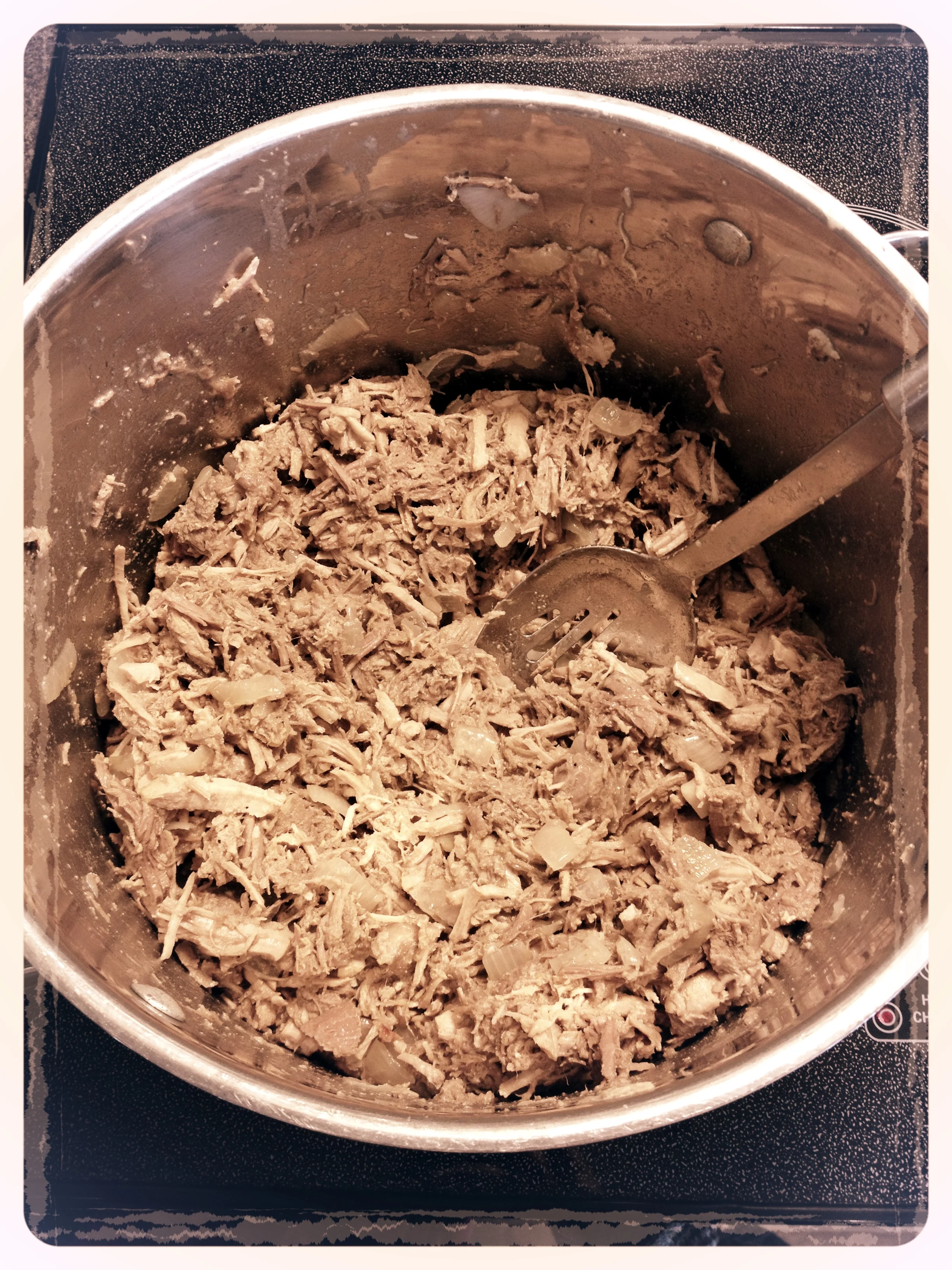 Stir the meat from time to time as it cooks, breaking the meat up into shreds as it cooks. When the meat is about shredded and is almost done cooking (it will give up its toughness as it cooks), add 4 chopped onions. Let this cook until it's a good consistency. This will take a total of about 5-6 hours, with the onions added for that last hour.